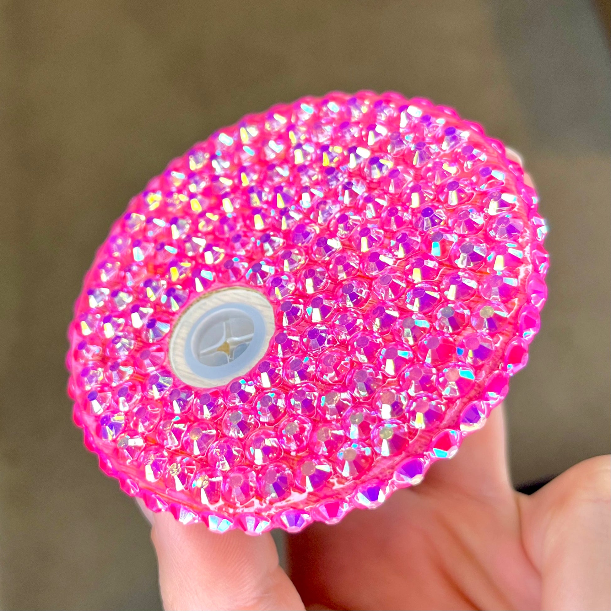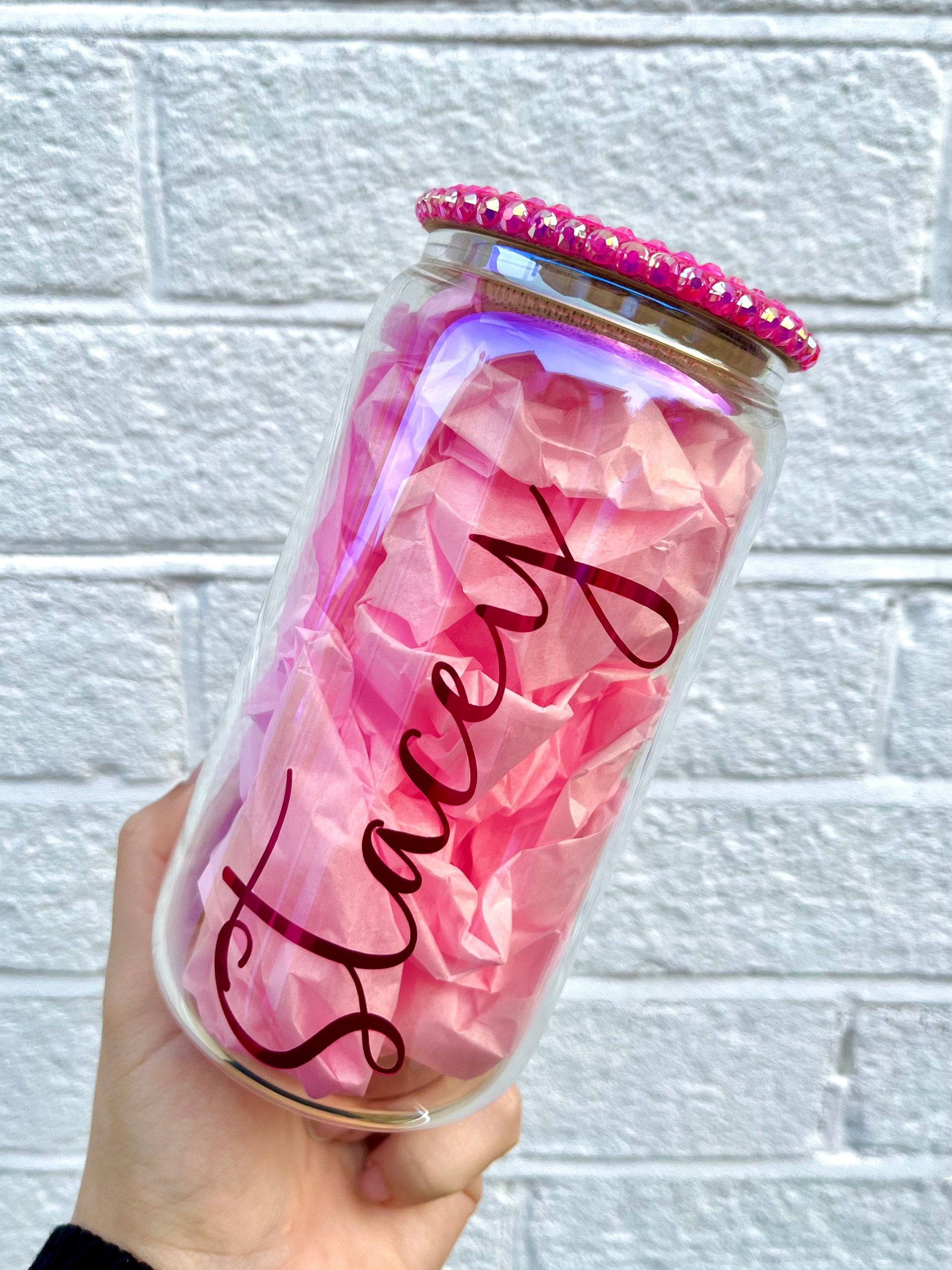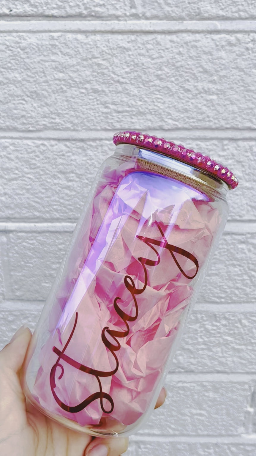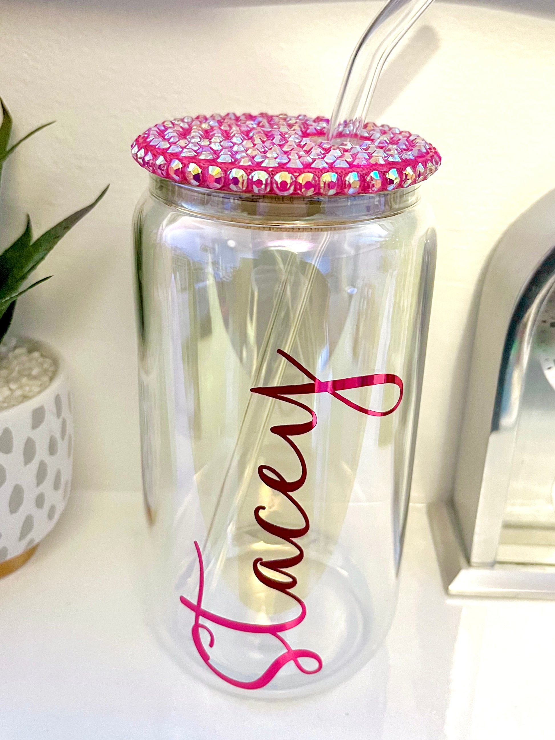 Includes a rhinestone covered bamboo lid and reuseable plastic straw.