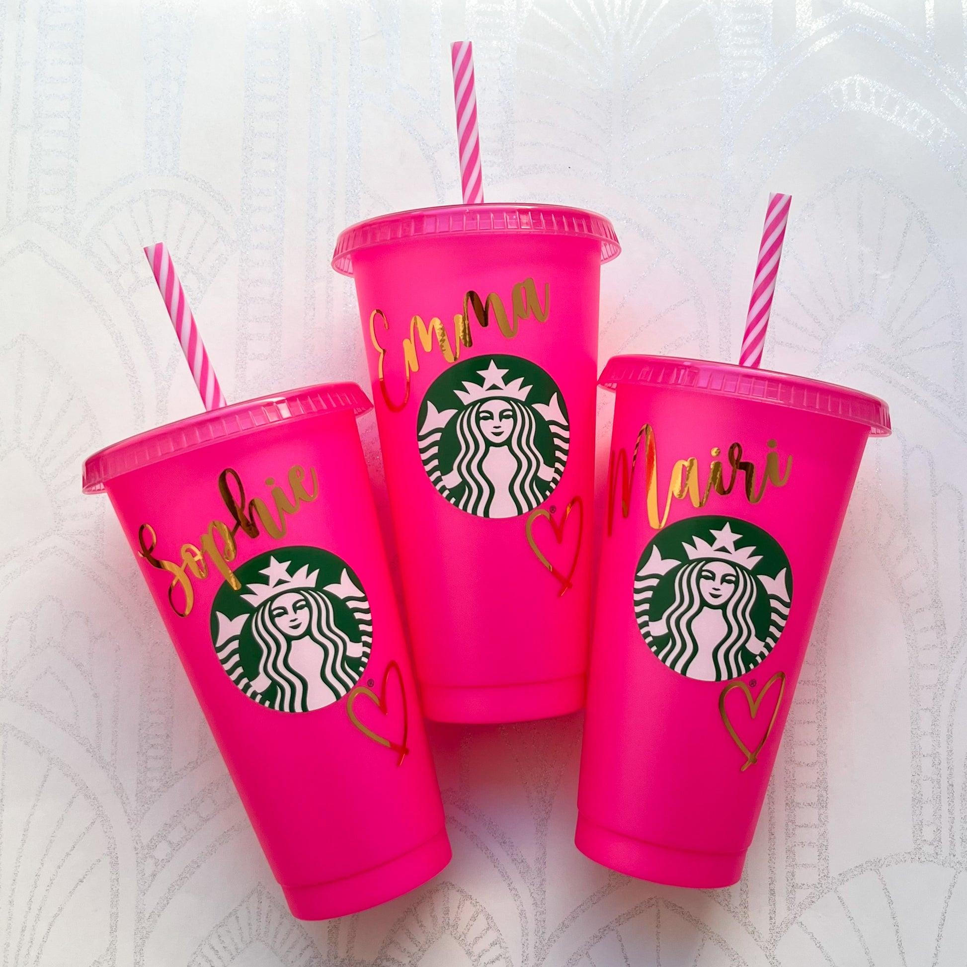 Reusable Starbucks 24oz pink personalised cold cup with name and heart design